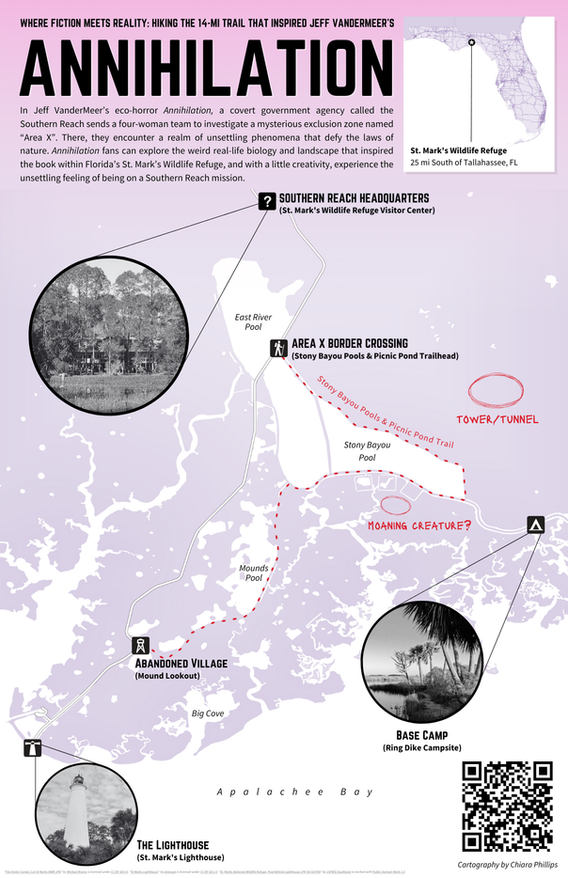 I decided to instead make a map that blends the 14-mile Stony Bayou Pools and Picnic Pond Trail in St Marks National Wildlife Refuge with the mysterious (fictional) elements and waypoints from the Southern Reach trilogy. 🙂